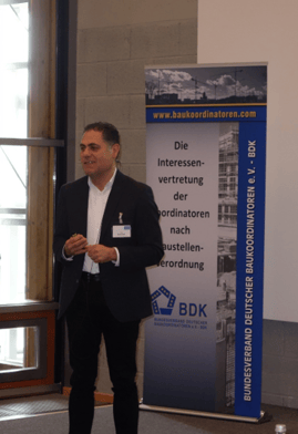 Einen völlig anderen Blick auf die Koordinatorentätigkeit vermittelte der Unternehmensberater Tim Matsoukas in seinem Vortrag „Baustellenkoordinator 2.0: Unsere Rolle für mehr Durchsetzungskraft, Sichtbarkeit und Akzeptanz nutzen“. Aufbauend auf einige Vorgespräche mit Koordinatoren aus der Praxis und den berufsverpflichtenden Normen/Quellen/Institutionen leitete er die hohen Anforderungen an die Tätigkeit des Koordinators ab. Er lenkte den Blick auf das Tagesgeschäft auf der Baustelle und die sich dort sehr häufig begegnenden widerstreitenden Interessen und Ziele der vielen Akteure, die sich auf der Baustelle treffen (Bauherr, Architekt, Bauleiter, Bauunternehmer, Bauarbeiter) oder auch im Hintergrund (Behörde, Auftraggeber, Bank, Jurist) beeinflussen. Will man alle Interessen berücksichtigen, entstehen komplexe Zusammenhänge und Herausforderungen, die noch verstärkt werden durch Zeitdruck, Planänderungen, interdisziplinäre sowie interkulturelle Kommunikation und der besonderen Arbeitskultur. Der Koordinator agiert dazwischen als Person, die mit dem Ziel die Sicherheit von Personen zu schützen, eine sehr wichtige Aufgabe hat. Diese Aufgabe obliegt ihm jedoch nicht allein. Deshalb ist er auf die Kooperationsbereitschaft aller Akteure angewiesen. Jeder Akteur hat seine eigenen Pflichten und trägt Verantwortung mit dem gleichen Ziel „Sicherheit auf der Baustelle“. Die Rolle des Koordinators dazwischen ist nicht einfach. Ohne Weisungsbefugnis und Hierarchie innerhalb des Systems hat er es oft schwer sich durchzusetzen. Diese Aussage bestätigten eine Vielzahl der anwesenden Teilnehmer.